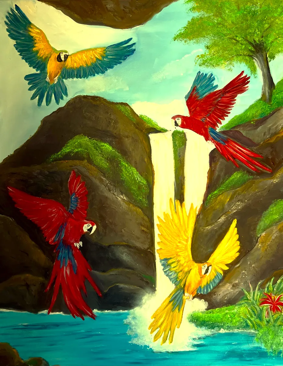In this captivating artwork, I intentionally employed vivid colors to dazzle your senses, inviting you to immerse yourself in the exquisite beauty of these magnificent birds. Their presence evokes sheer happiness and joy, as they flutter with exuberance around the cascading waterfall. The vibrant macaw, revered by indigenous cultures, served as a protective guardian aligned with the southern direction. It also symbolized abundant summertime, fertility, and restorative healing.