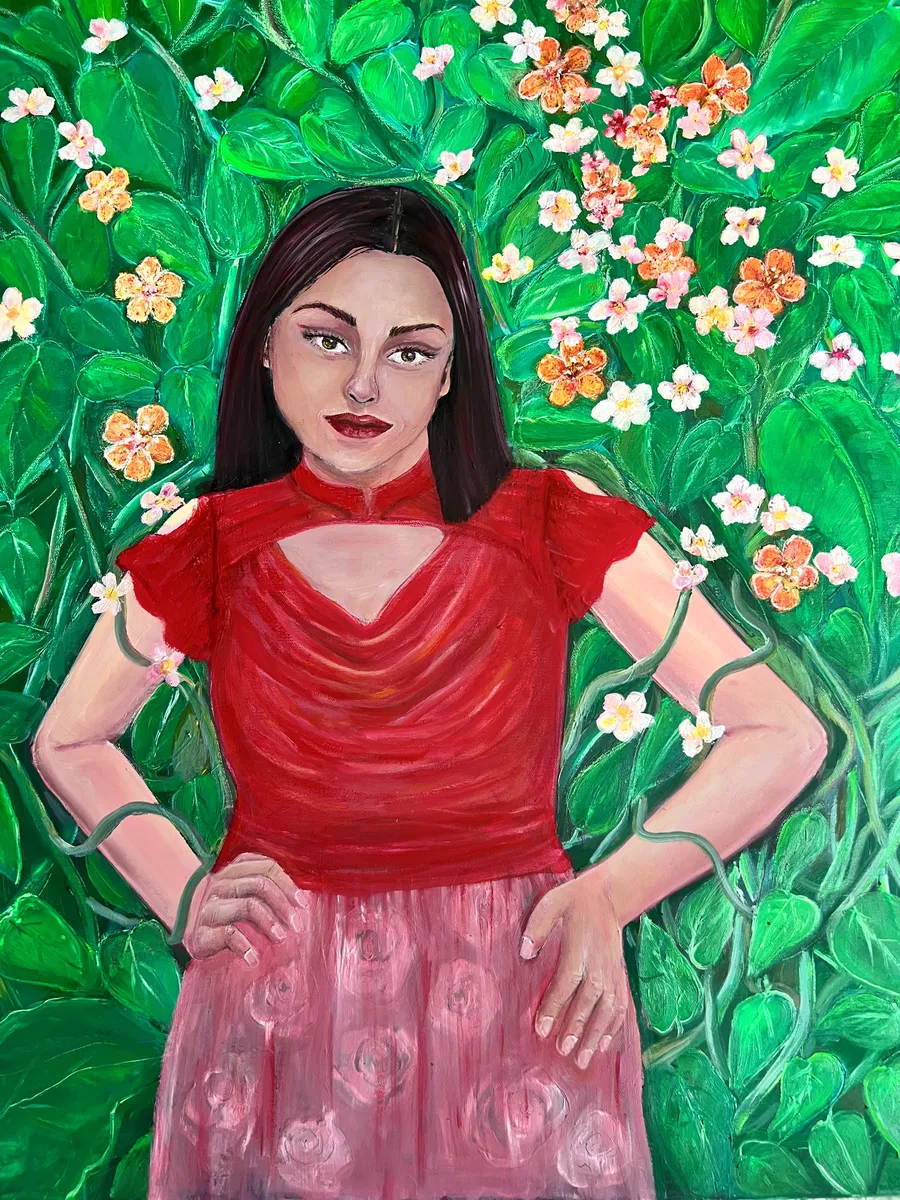 In the heart of a vibrant canvas, a woman is depicted, bound by the exquisite tendrils of nature’s vines. She is not held captive, but rather, she is anchored, grounded by the nurturing essence of the earth. Her attire is a radiant red, a symbol of her strength and passion, contrasting beautifully with the verdant surroundings. Her face is illuminated by a gentle smile, a serene expression of contentment and inner peace. She is in harmony with the natural world, appreciating its grounding effect, its rhythm, and its cycles. The vines, though they bind her, do not constrict. Instead, they connect her to the earth, symbolizing her unity with nature. Around her, a profusion of flowers bloom, a riot of colors and fragrances. They represent the beauty and diversity of life, adding to the painting’s overall sense of joy and tranquility. This is a woman who, though tied down, is not restrained. She is free in her acceptance and appreciation of the earth’s grounding embrace. This painting is a celebration of that connection, of the strength found in harmony with nature. It is a tribute to every woman who finds power in being grounded, who smiles in the face of adversity, and who blooms wherever she is planted.