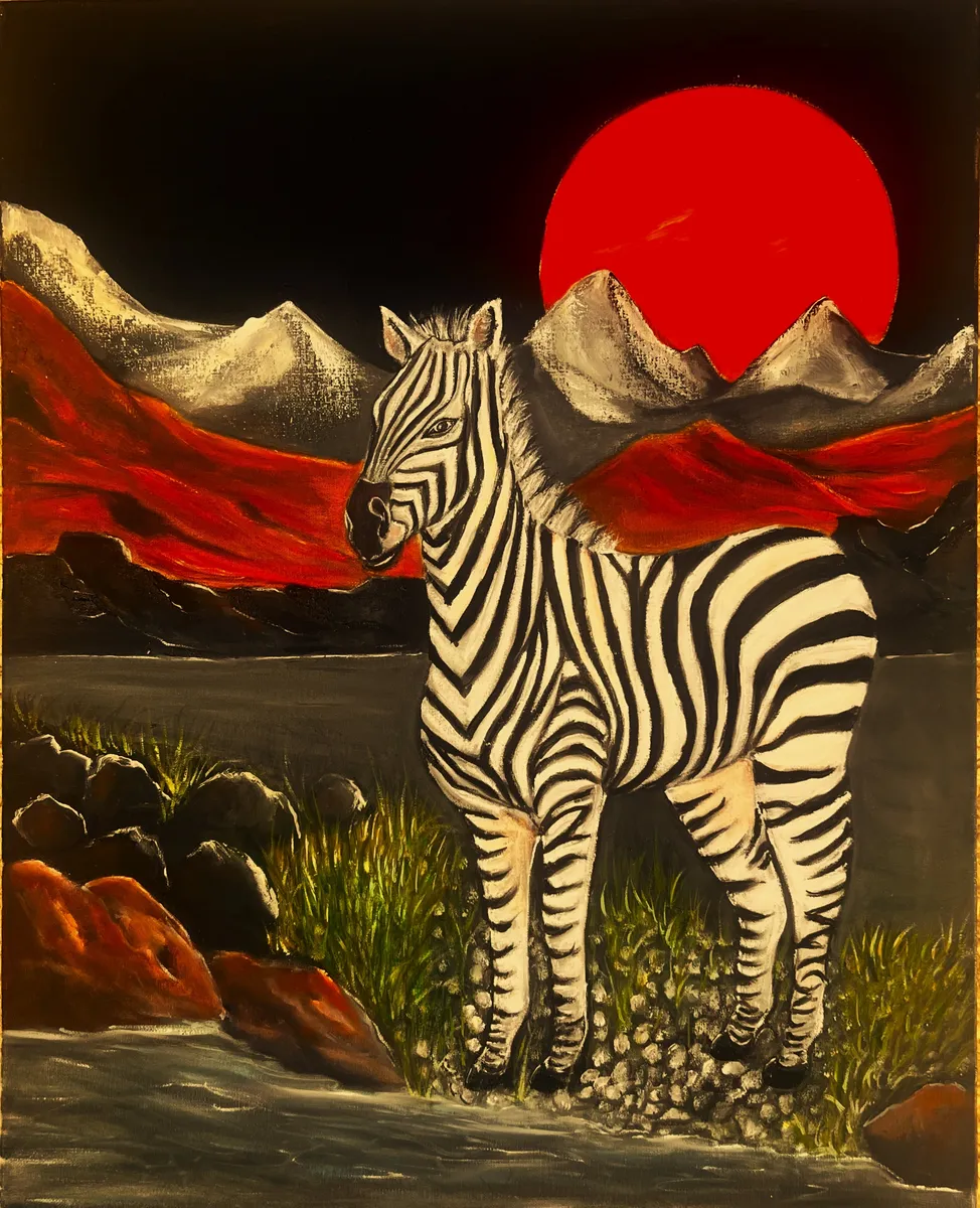 Zebras are one of my favorite animals ! The painting depicts a zebra against the backdrop of a red sunset and dark mountains. The vibrant colors of the painting make it a joyful and uplifting piece of art. It’s a testament to the beauty of nature and the power of art to evoke emotions.