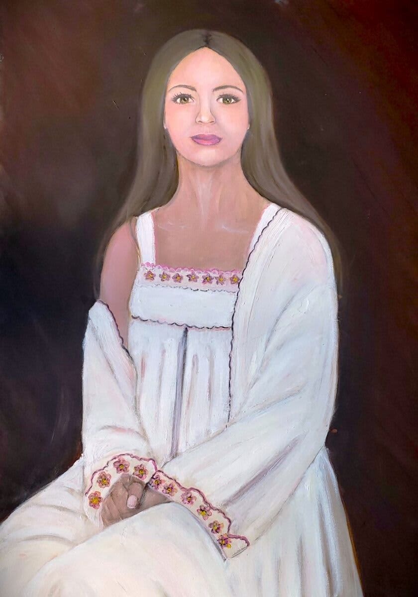 Titled “La Fierté,” or “Pride,” this painting features a woman adorned in a green hijab, her eyes meeting ours with a profound gaze. “La Fierté” is the emotion she embodies, standing resilient against all adversities. She dons her hijab with pride, for it is an integral part of her identity, her culture, and her power, contributing to her sense of completeness.
