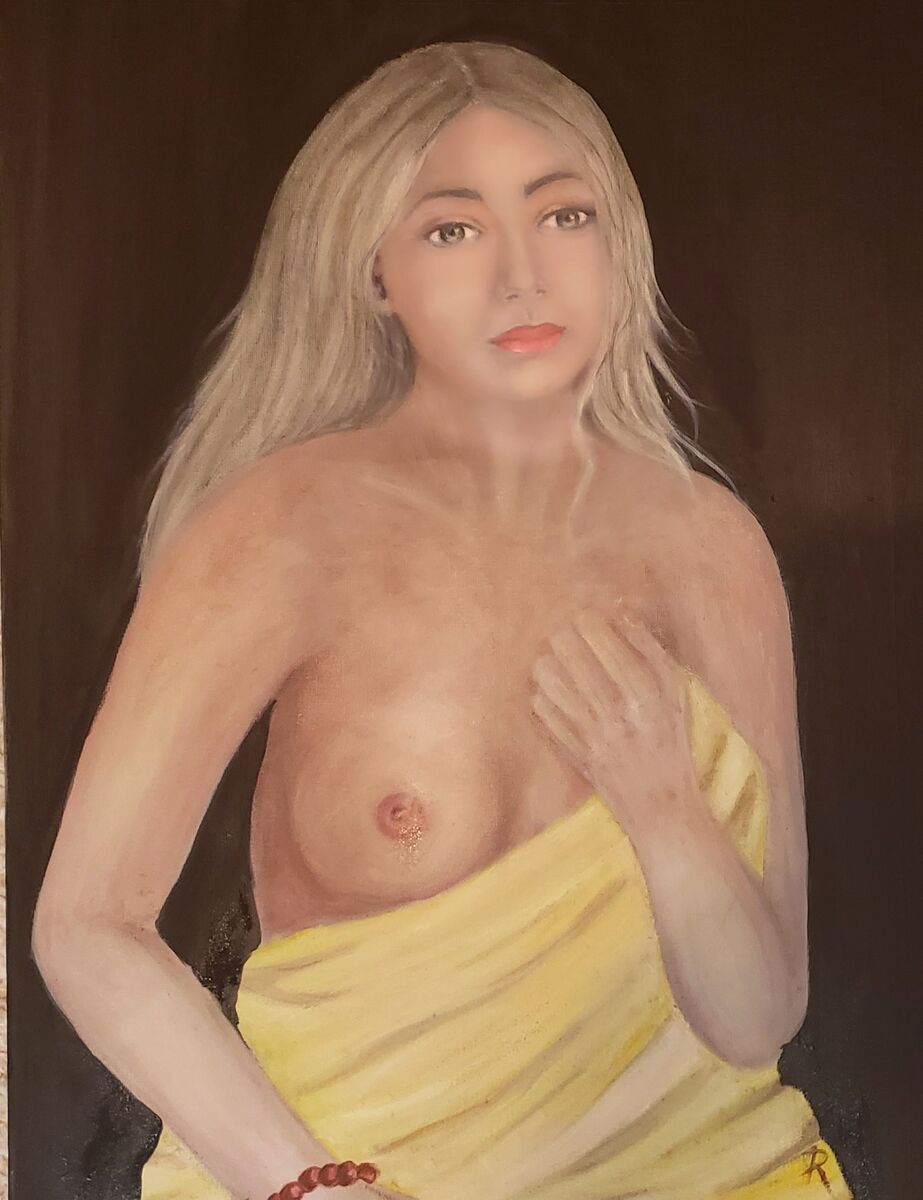 La Femme Fatale This painting portrays a woman, standing with her arms raised, a towel casually wrapped around her waist, her upper body unveiled. The title of the piece speaks volumes. It’s a testament to our secret desires, the freedom to embody our fantasies and be who we truly wish to be. She is a reflection of us all, encapsulating our shared human experience.