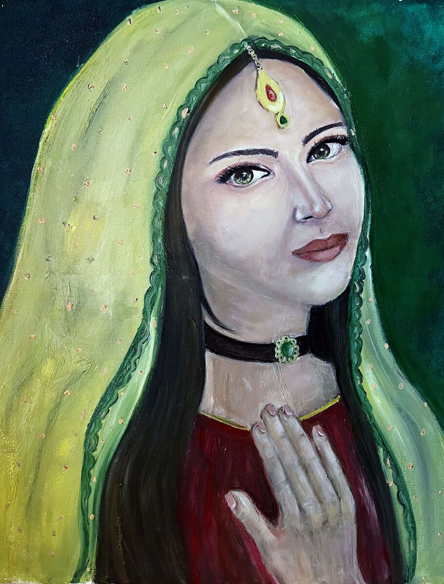 Titled “L’indocile,” this painting portrays a woman of rebellion. At first glance, she may appear to conform, as she proudly dons her country’s saree, a testament to her deep-rooted pride in her heritage. However, beneath this facade lies a fierce spirit. Never underestimate her; she stands strong against discrimination and serves as a guardian for women advocating for their rights.