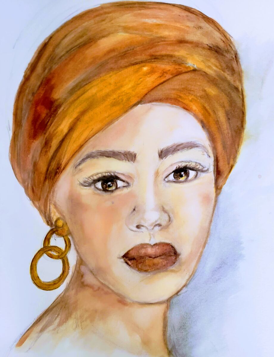 This painting portrays a woman of remarkable beauty, both inwardly and outwardly. She carries herself with modesty, yet has a fondness for vibrant colors and all things beautiful. As a single mother, she pours her heart into providing for her children, always maintaining a smile to reassure them that all is well. Despite her struggles and occasional moments of despair, she remains profoundly grateful. She cherishes the freedom of living in a country that respects her choice of attire, a place where her voice will not be stifled due to her appearance. She is a testament to resilience and gratitude.