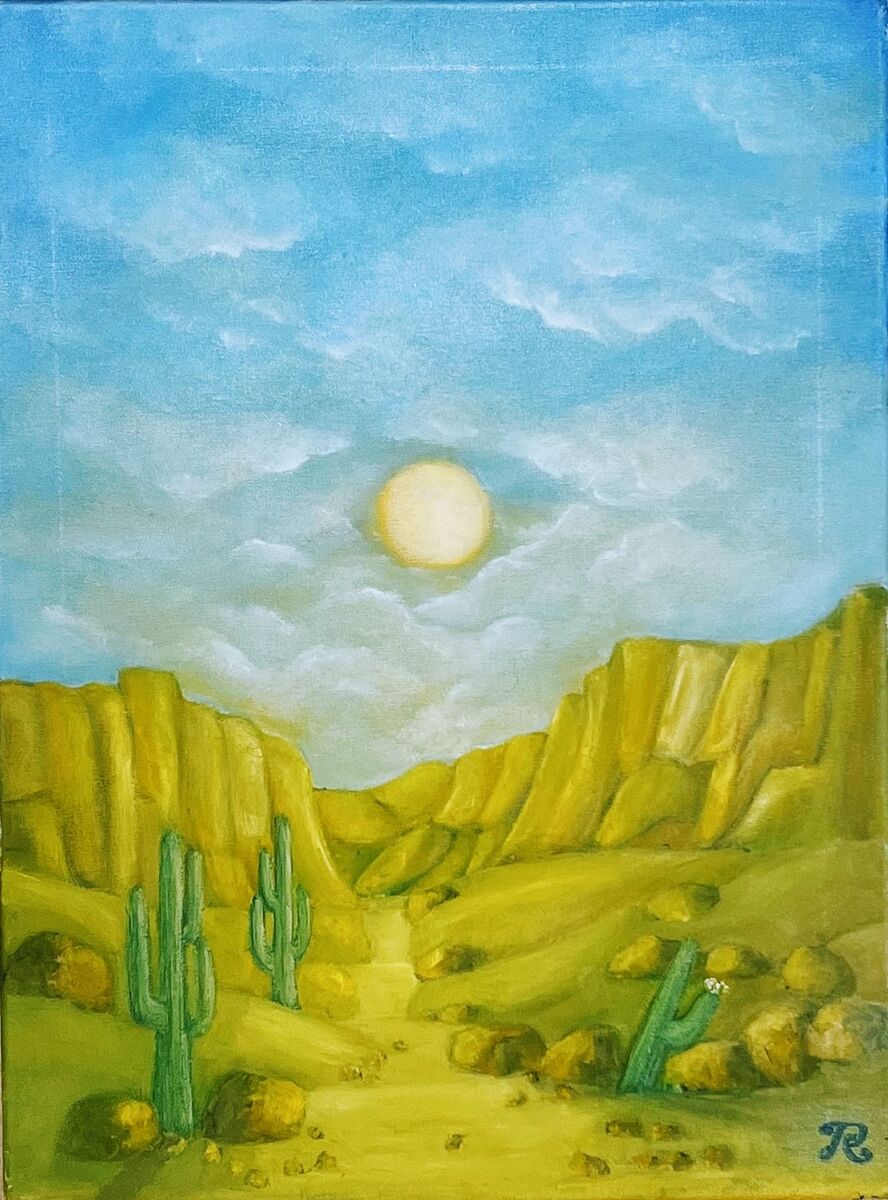 This painting, awash with hues of green and blue, evokes the essence of the Sonoran Desert in the United States. The majestic saguaro cacti stand tall and proud, akin to vigilant sentinels overseeing the landscape.