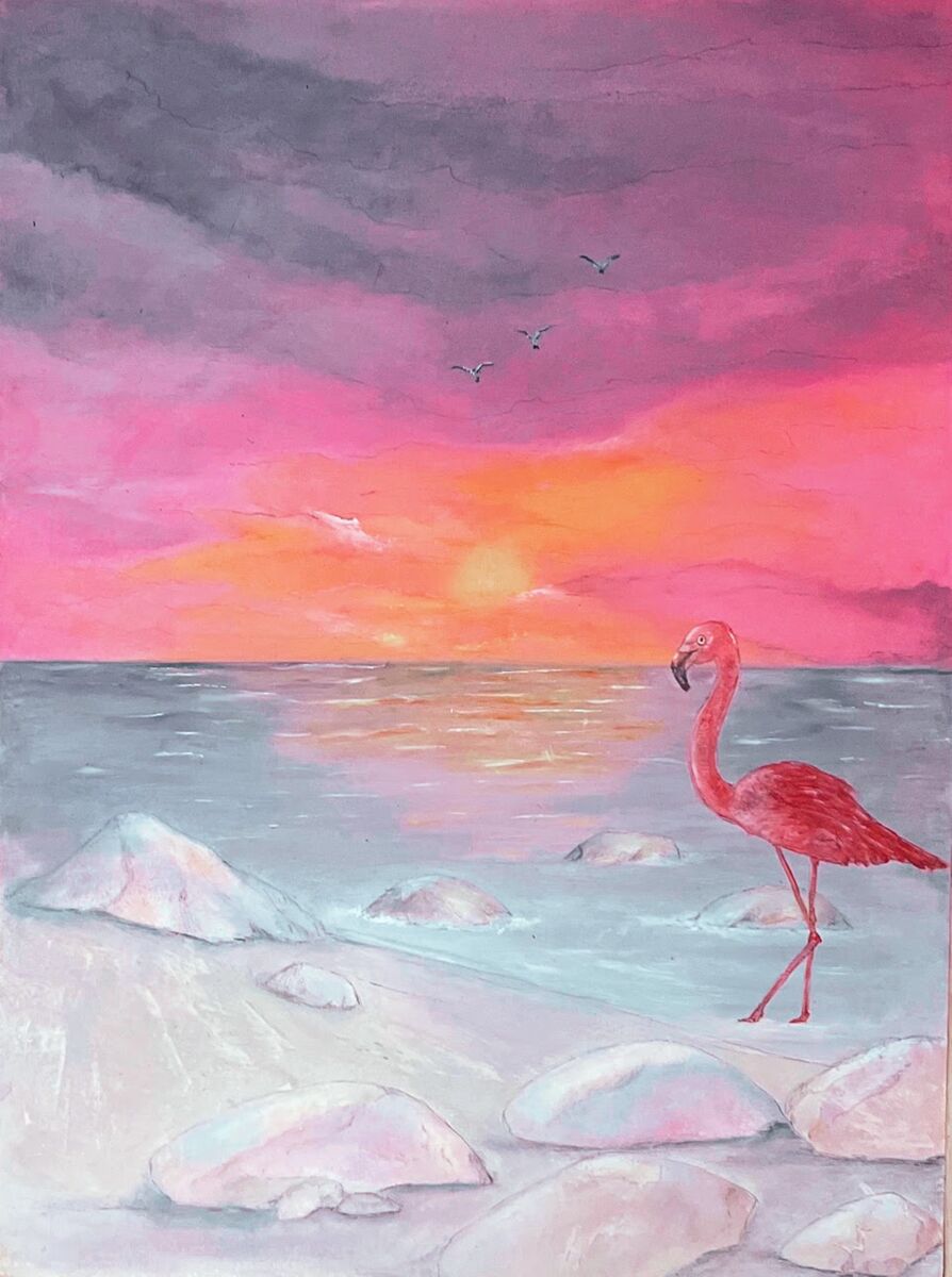 “La Vie En Rose” is a painting awash in shades of pink - the flamingo, the sky, the stones, all bathed in the same rosy hue. It’s a visual representation of life seen through rose-colored glasses, a world tinted with optimism and hope. It’s a gentle reminder to breathe, to reassure ourselves that everything is alright, even when it may not seem so. It invites us to imagine, if only for a moment, that all is well, and then to release that breath, letting go of our worries. It’s a testament to the power of perspective and the human capacity for resilience and hope.