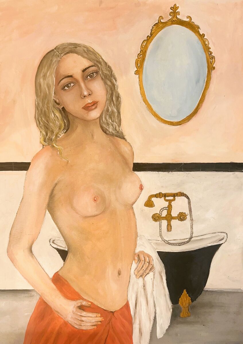 This painting is a celebration of self-care, of the sacred moments we carve out for ourselves amidst the chaos of life. It’s a gentle reminder to cherish these moments of solitude, to close the door on the world outside, to breathe in the tranquility, and to let the warm water wash away the stresses of the day. It’s an invitation to find serenity in solitude, to reconnect with oneself, and to revel in the simple yet profound act of taking a bath. It’s a testament to the healing power of water, the comfort of solitude, and the transformative power of self-care. It’s a call to love oneself, to nurture oneself, and to find peace in one’s own company. She is every woman, every person, seeking serenity in solitude. She is us, and we are her.