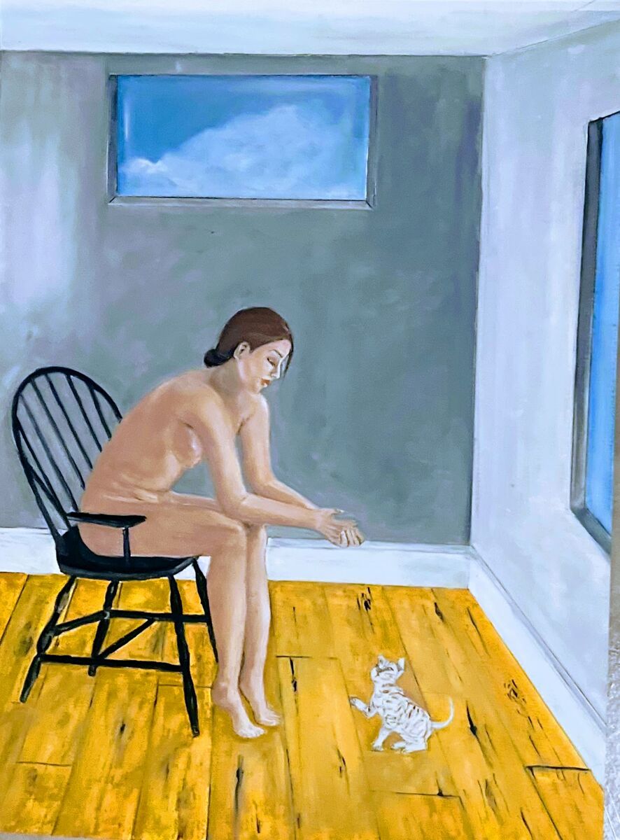 In this painting, I’ve depicted a woman embodying fragility, not in the sense of being broken or destroyed, akin to glass, but rather in her palpable vulnerability. Her lack of clothing amplifies this sense of fragility, as if she stands bare and unprotected against the world. Despite being in a room bathed in light, a sense of loneliness pervades, accentuated by the solitary chair and the stark gray walls. This artwork aims to encapsulate the profound solitude that often accompanies human fragility. It’s a poignant reminder that we’ve all experienced moments of such vulnerability, where we’ve felt fragile, exposed, and alone. This woman is a mirror reflecting our shared human experiences. She is us, and we are her. She is every person who has ever felt vulnerable, and her story is our story. She is us, and we are her. She is the embodiment of the fragility and resilience of the human spirit. She is all of us.