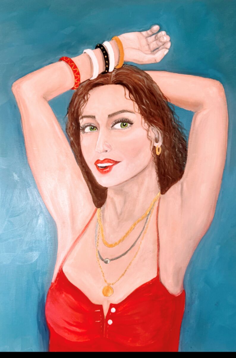 In my artwork, I sought to convey her freedom through a blend of visual elements that symbolize openness and liberation. The use of expansive, unbounded spaces in the background suggests an infinite realm of possibilities. Her posture is relaxed yet confident, capturing a sense of comfort in her own skin. The color palette is vibrant and unrestrained, reflecting a life lived vividly and without limitations. Each stroke and hue is a testament to her free-spirited nature, crafting a narrative of self-expression and authenticity. Her playfulness is captured in the impish twinkle of her wink, a subtle yet powerful gesture that reveals her mischievous side.