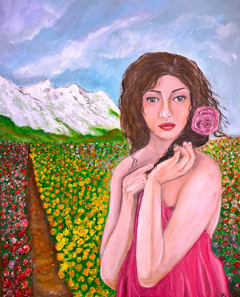 This is a vibrant painting that portrays a young woman standing amidst a sea of roses, with colorful lines forming a mesmerizing backdrop. A single flower adorns her hair, adding to her charm. The painting invites you to imagine a breathtaking landscape filled with roses stretching as far as the eye can see, with majestic mountains providing a stunning backdrop. It evokes the warmth of the sun on your face, immersing you in a sensory experience. This artwork aims to encapsulate that feeling, that moment of awe and tranquility amidst nature’s splendor. It’s a celebration of the beauty of the natural world and our connection to it. She is every person who has ever been moved by the beauty of nature.