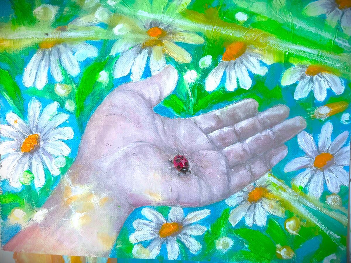 This painting captures a hand cradling a ladybug, encircled by a burst of daisies, serving as a vibrant portrayal of spring. Spring is a perennial symbol of rebirth that never ceases to astound me. As the trees, plants, and animals awaken from their winter slumber, life blossoms anew. This resurgence of life fills my heart with joy and sends waves of ecstasy through me. It’s a celebration of the cyclical nature of life and the enduring allure of spring. It’s a testament to the resilience of nature and the joy it brings to our lives.