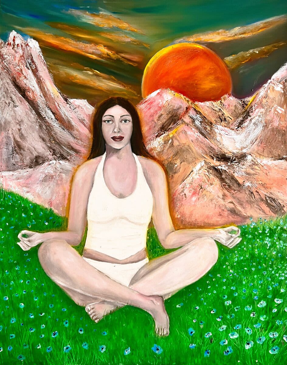 The background of this painting was inspired by the pink sunsets of the Himalayans. The flowers are blue poppies that grow there. I wanted to paint an atmosphere of peace and calm