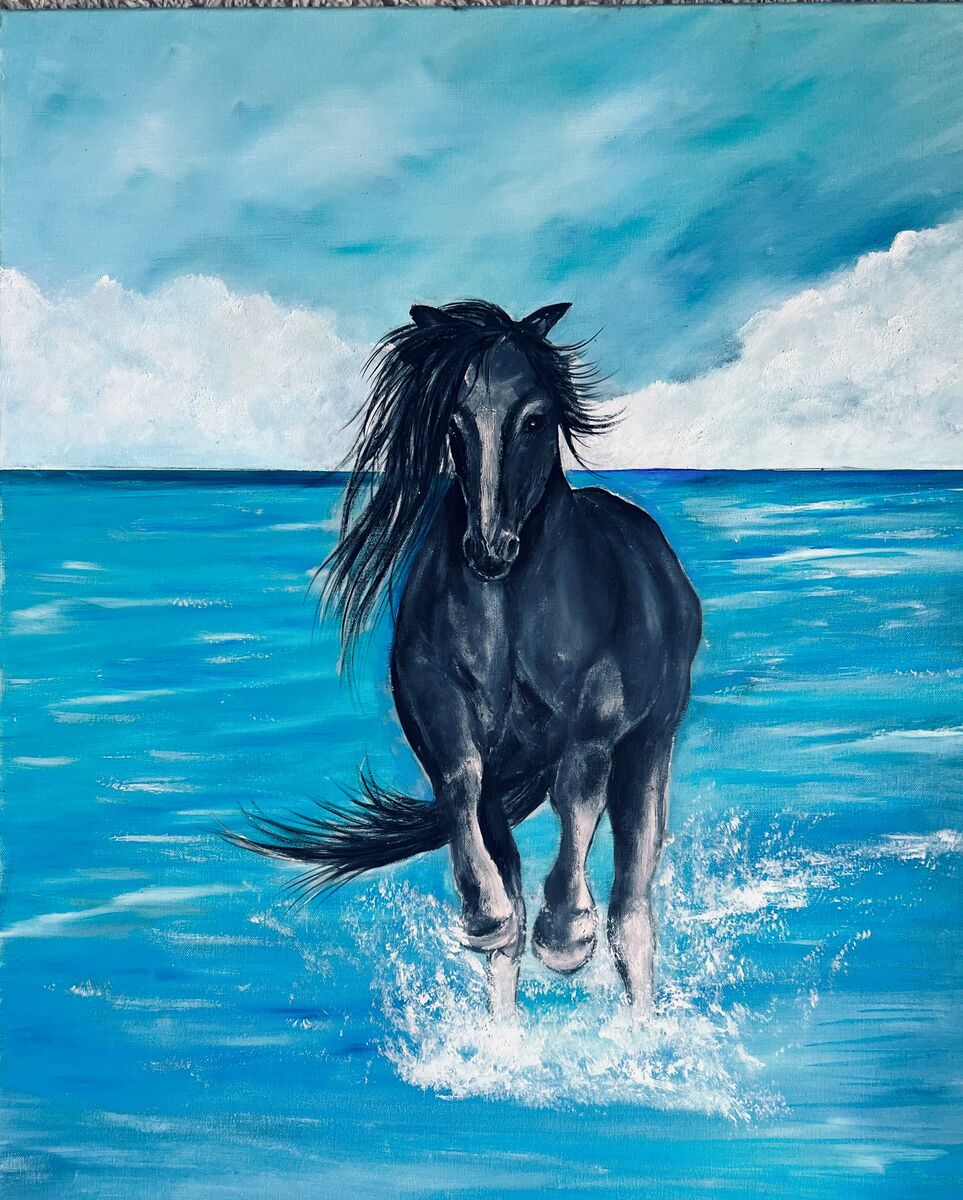 The shoreline appears at the edge of perception—a threshold between worlds. Here, the sea and sky blend, their hues merging into an infinite horizon. Against this luminous backdrop, a black horse emerges—a creature woven from myth and magic. Its silhouette stands, stark against the expanse. Breaking free from water, it defies the pull of gravity. Each hoof barely skims the surface, leaving behind liquid stardust. The ripples echo like forgotten spells. The horse is both majestic and beautiful. Its mane dances with the wind—a cascade of midnight silk.