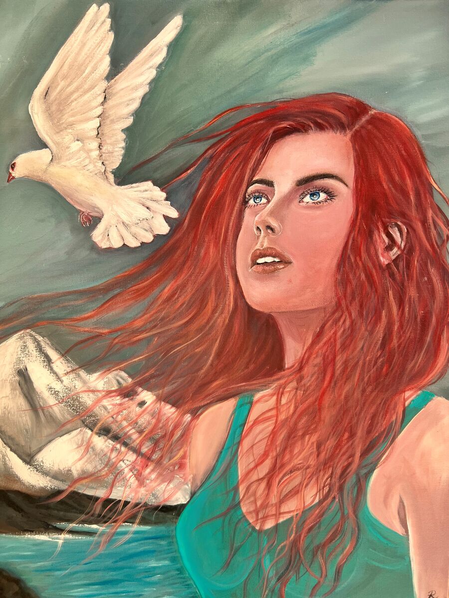 The painting portrays a woman who is one with nature. She is as free as the dove, embodying a sense of liberation and tranquility. The painting evokes a sensation of pure fresh air, and the wind in her hair adds to that feeling. It is a testament to the power of nature to provide a sense of freedom and rejuvenation.
