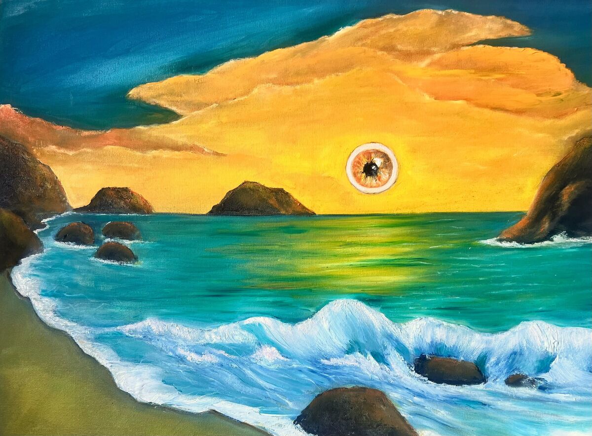 In this artwork, my aim was to craft a marine landscape that resonates with familiarity, yet diverges in its uniqueness. It portrays an alternate universe, teeming with vivid hues, overseen by an observant eye that replaces the sun. The tranquility and desolation of the scene suggest an uninhabited land. It exudes an uncanny, yet enchanting aura.
